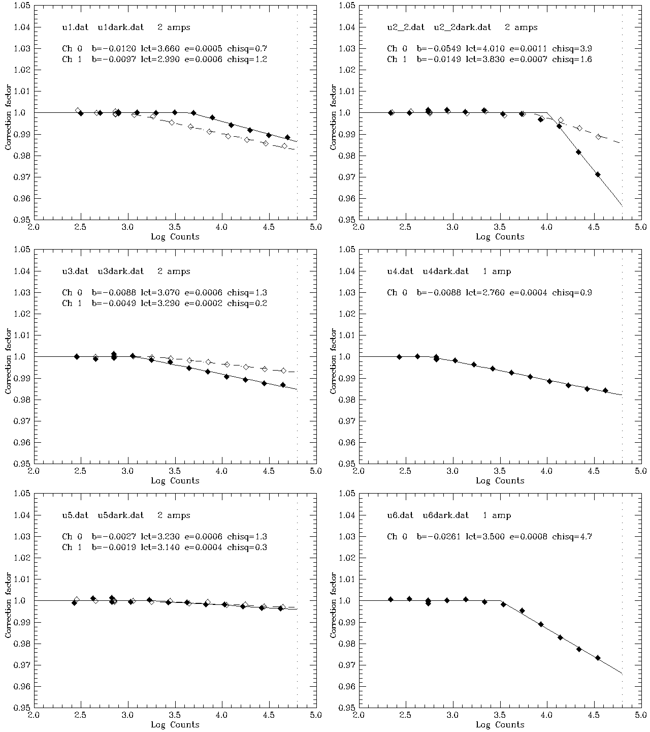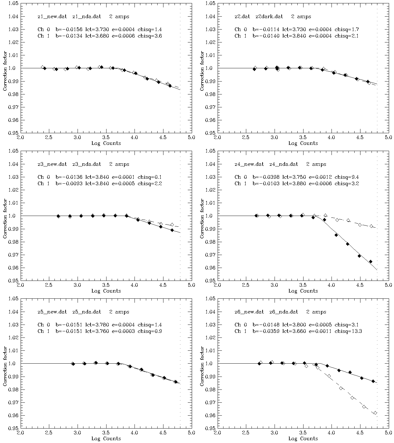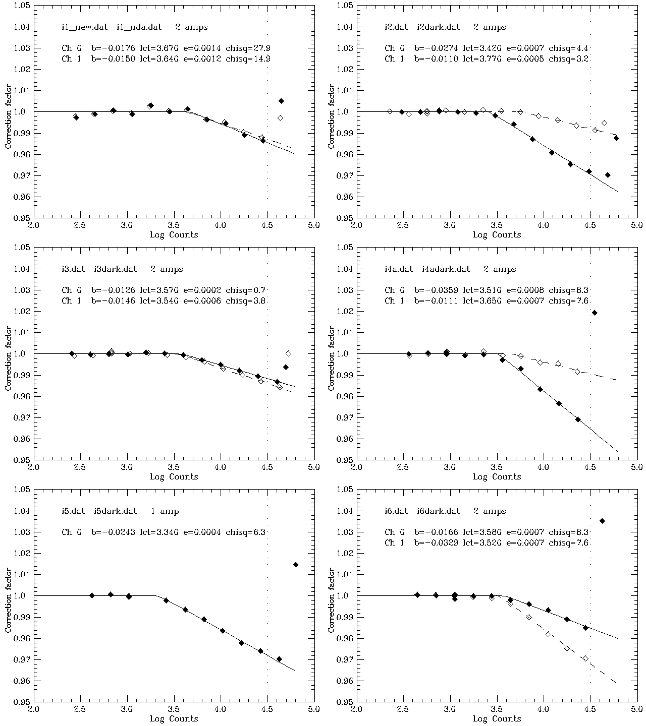 We designate CCDs using the filter (which corresponds to the row) and column. For example, the g4 CCD is the CCD in the fourth column in the row covered by the g filter. The nonlinearity plots below are grouped by filter. In these plots the filled points belong to amplifier 0, the empty ones to amplifier 1 (if applicable). The Amplifier 1 fits are dashed. The vertical dotted line is the adopted saturation level for that device; points to the right of this line are ignored in the fits.