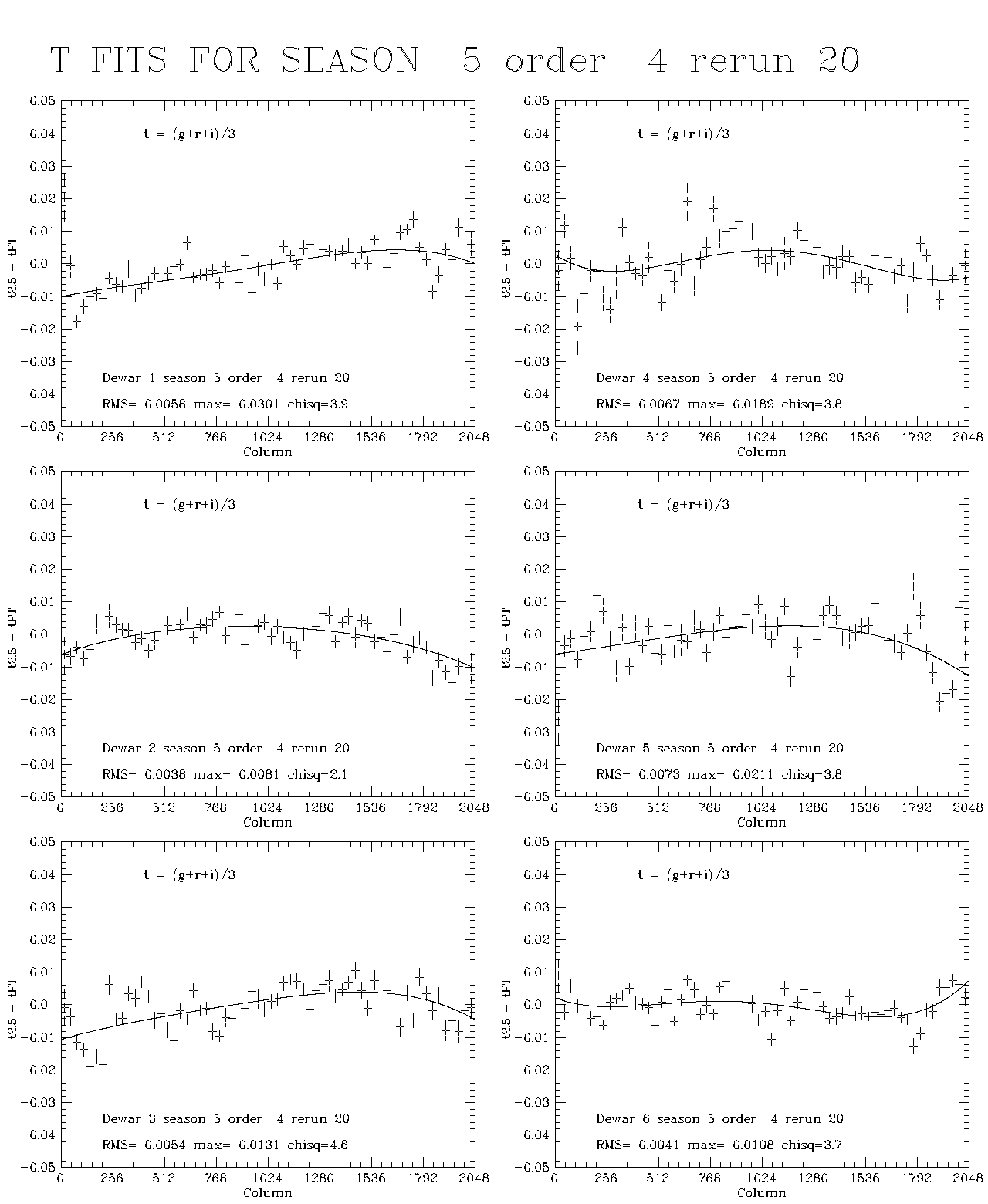 Five plots which illustrate the effect of the processing described are shown here for season 5, which was the least well-behaved season in this data set. Figure 1 illustrates the t fits for this season. The formal chi-squares/dof are large, of order 3-4, but the rms scatter about the fourth-order Tchebychev fit is of order 5-7 millimagnitudes. In most cases the polynomial is a very much better fit than a constant. The next four plots illustrate the fit to the color errors: gr (Fig. 2), ri(Fig. 3), ug1 (Fig. 4), and ug2 (Fig. 5). The two ug plots are shown to illustrate the excellent agreement between the two estimates, which are derived from uperp1 and uperp2, respectively. In these cases, the chi-squares are of the same order, and the rms deviations from the fits about 6, 3, 13, and 13 millimag, respectively. Since the ug1 and ug2 fits are averaged, the rms is about 10 millimag for ug and considerably smaller for the other bands. The color error dominates in u, the errors in t for all the other bands. Formally at least, the rms errors in the 5 bands are of order 12, 7, 6, 6, and 8 millimagnitudes for u, g, r, i, and z, respectively (the error in iz, not shown, is about 4 millimag). This is a sizeable part of the error budget for our goal of .02 magnitude RMS total, but since most of the rms is in small scale features whose reality is in doubt and we do not understand the noise very well, we may well be doing considerably better. We are at least doing no worse than these numbers, which ascribe no noise to the data. If one chooses to believe the chi-squares, the contribution of noise is only of order 10 percent of the error, but it may well, in fact, be most of it.