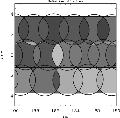 To demonstrate the SDSS procedure, consider the following few figures, which represent how targets were selected and tiles defined along a section of the SDSS near the Northern Celestial Equator. The region shown was successively targeted in Tile Region 4, Tile Region 5 and Tile Region 14. The images show: