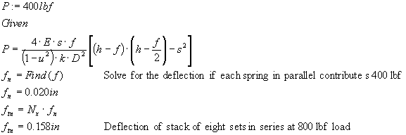 The drawing of the camera stirrup from Jim Gunn shows eight sets of springs in series. Each set is made up of two springs in parallel. This arrangement provides for the load of 972lbs when all of the sets of parallel springs are deflected by .026". The total deflection of the stack comes from multiplying the number of sets in series by the deflection.
